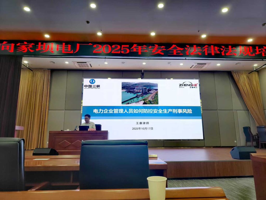 2025年10月17日,王康律师在向家坝水电站二楼报告厅,为向家坝水电站数十名管理人员,开展了题为《电力企业管理人员如何防控安全生产刑事风险》的培训。